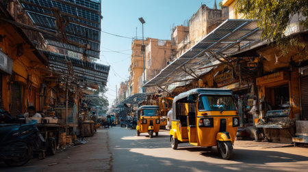 Capture the lively essence of a city market with bright yellow auto rickshaws navigating through streets filled with shops, under sunny skies.