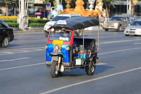 A three wheeled tuk tuk taxi on a street in the Thai capital