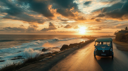 A serene coastal scene with a vehicle driving along a winding road by the ocean during sunset. The vibrant sky and crashing waves create a picturesque moment.