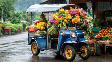 A tuk-tuk with an open rear, filled with colorful flowers and produce, parked at a local market, showcasing traditional commerce.