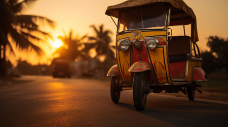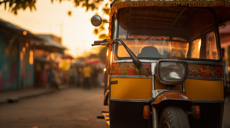 tuk-tuk parked on the side of the road at sunset, captured in a super close-up shot. this low angle photograph, taken with the high detailed sony alpha a7 mark iv, showcases the realistic and vibrant colors of the scene. the image is shot in 8k resolution, allowing for an immersive viewing experience. ai generated