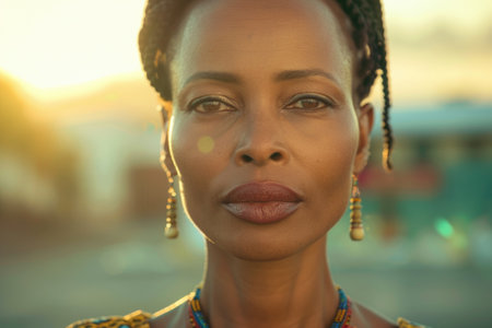 Captivating portrait of a woman in warm evening light, embracing cultural heritage