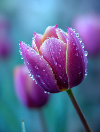 Close-up of a vibrant purple tulip surrounded by water droplets, captured in a peaceful garden during the soft morning light.