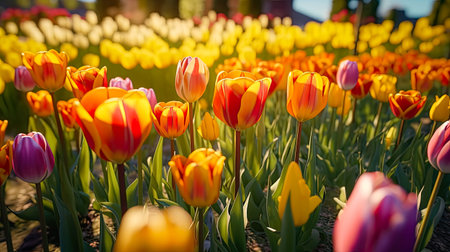 A stunning view of a vibrant tulip field bathed in sunrise light, showcasing a beautiful array of colors and blossoms. Perfect for spring-themed imagery.