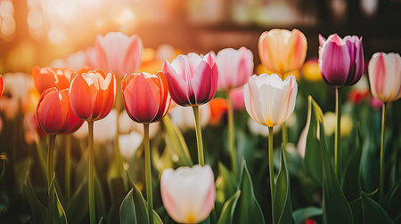 Colorful tulip flowers blooming in the garden at sunrise.