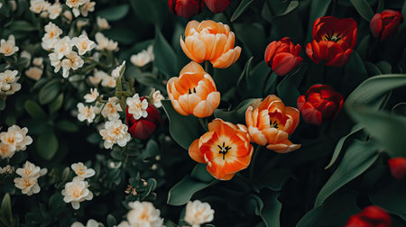 This image captures a stunning arrangement of vibrant tulips in red, orange, and yellow alongside delicate white flowers, showcasing the beauty of nature in full bloom.