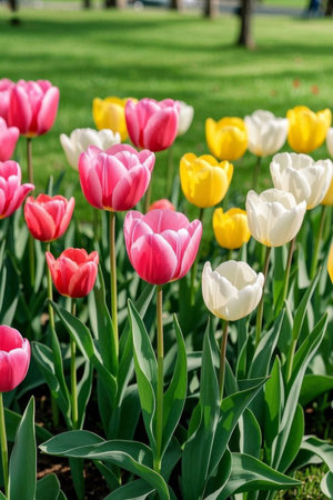A vibrant display of tulips showcasing a spectrum of colors in a serene garden setting. Ideal for spring themes and floral beauty concepts.