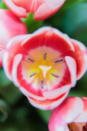 Red and white bud of a blooming tulip. Macro photography inside. Change of focus, close-up.
