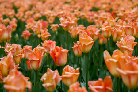Close up of blooming flowerbeds of blossoming tulips during spring. Public flower garden, Netherlands.