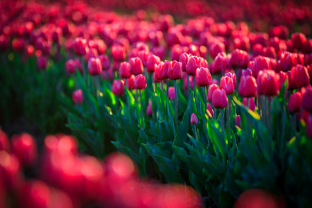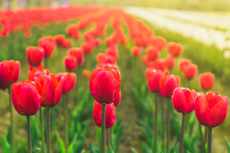 Tulip field in the sunlight with bokeh effect.