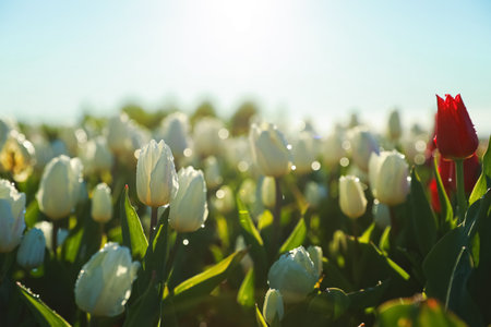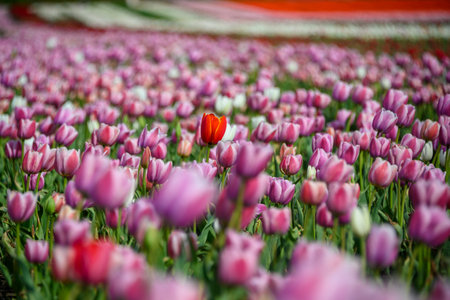 In a vast field, a stunning array of tulips flourish during spring. The vibrant pink and white blooms create a picturesque landscape, highlighting a solitary red tulip.