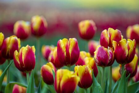 Beautiful colorful red and yellow tulips background. Field of spring flowers. Flower bed tulips in Danang, Vietnam, close up