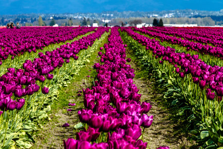 Rows of purple tulip flowers on tulip bulb farm on sunny afternoon