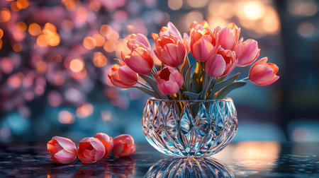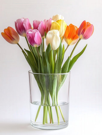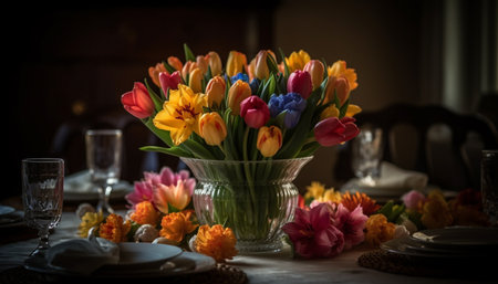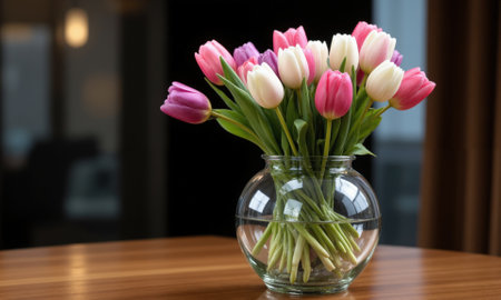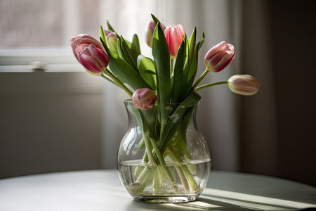 delicate spring tulips in glass vase, perfect for a table centerpiece, created with generative ai
