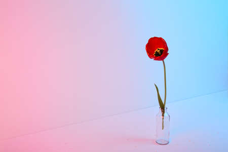 One red tulip in glass vase on pink and blue background.