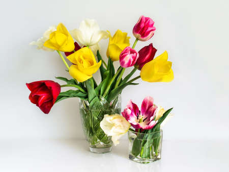 Beautiful pink and yellow tulips in different flasses on white