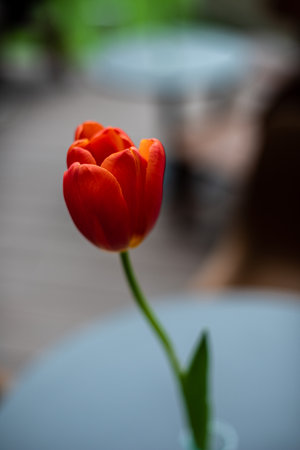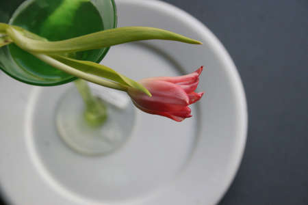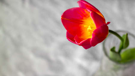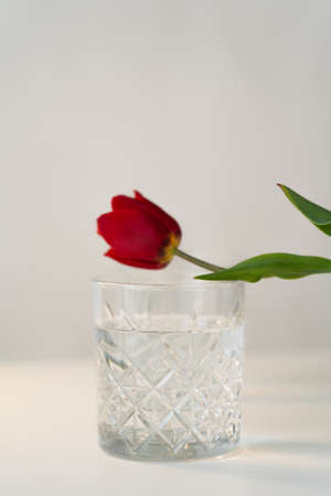 One red tulip with a green leaf is in a glass. Medium shot. Shooting from above. Horizontal light background with place for text. Focus on the flower.