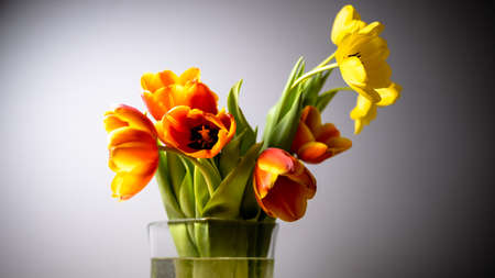 bouquet of red and yellow tulips standing in a glass vase, vignette on gray background