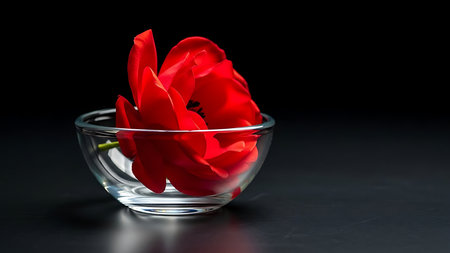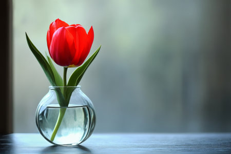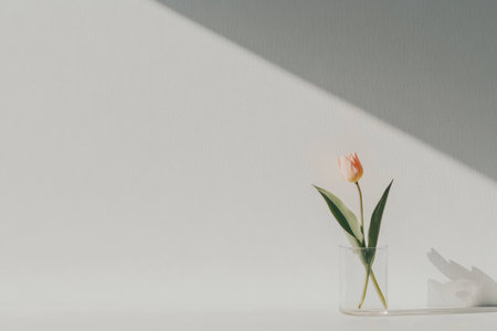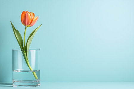 minimalist wallpaper, tulip flower in a clear glass vase, large copyspace area.