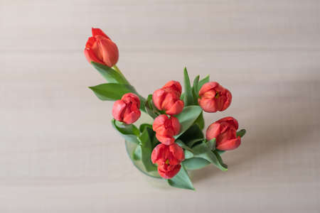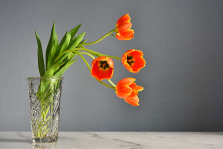 Red tulips in a glass vase. Spring still life.
