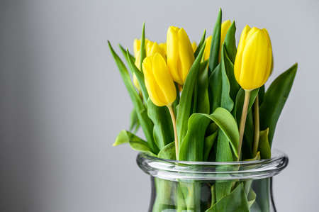 Bouquet of yellow tulip flowers in vase on gray background. Concept for greeting card for Easter, Mother's day, International women's day, Saint Valentine's day. High quality photo
