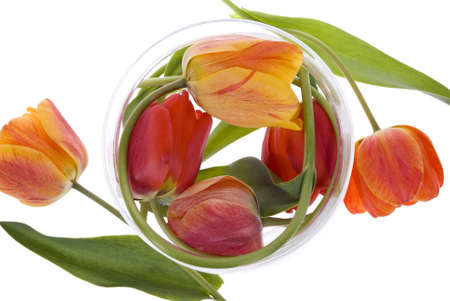 red and orange tulips in glass on white background