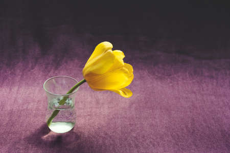 One small yellow tulip in a glass on purple background.