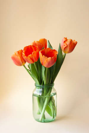 Bouquet of tulips in orange and rich red colors on beige background. Concept of spring, Womens Day, Mothers Day, 8 March, the holiday greetings.