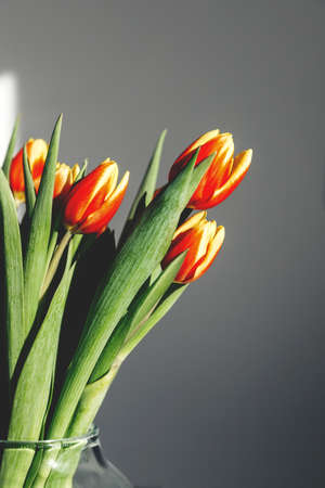 Close-up bouquet of spring red-yellow tulips in a glass vase. Bright sunlight, harsh shadows. Vertical orientation. Copy space