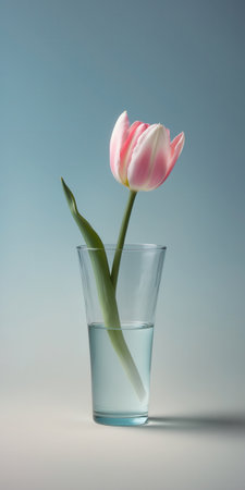 Single pink tulip with green stem placed in a clear glass vase filled with water. Minimalist composition with a soft gradient background, creating a serene mood.