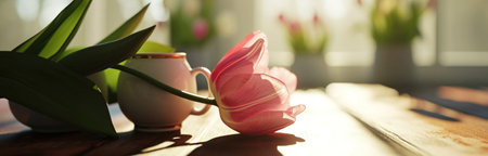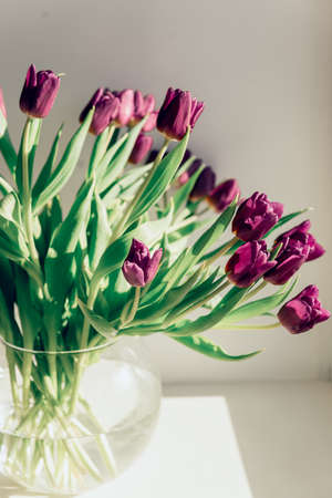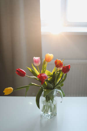 Bunch of fresh cut tulips in vase on a table with soft focus and bright light from the window