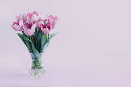 Tender violet tulips in a vase on a violet pastel background. Greeting card for Women's day. Place for text.
