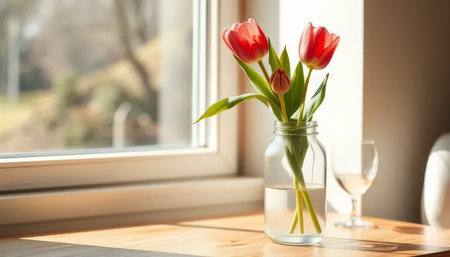 Vase of red tulips sits on a table next to a wine glass. The vase is filled with water and the tulips are in full bloom, creating a beautiful and serene atmosphere