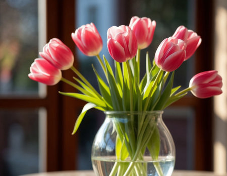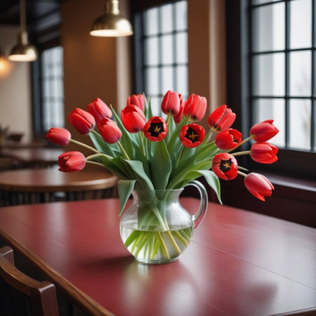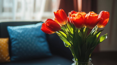 Beautiful bouquet of red tulips fills a clear vase, bringing color and life to a cozy interior with colorful cushions and soft natural lighting. Ideal for decoration or nature themes.