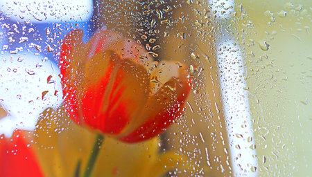 The image of two tulips on a background of a glass in drops covered by the sun