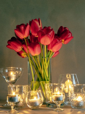 picture with red tulips in a vase by candlelight, interesting reflections and shadows