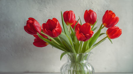 A bouquet of bright red tulips is arranged in a clear glass vase. The vibrant flowers stand out against a soft neutral background capturing the essence of spring.