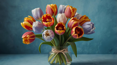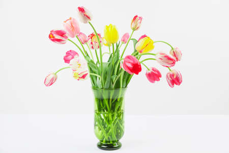 Multicolored tulips in a vase, beautiful spring flowers.