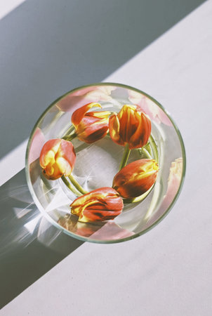 Above view of vibrant red and yellow tulips elegantly arranged in round glass vase filled with water, casting soft shadows on white surface