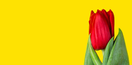 Bud of a red flower on a yellow background. Spring tulip.