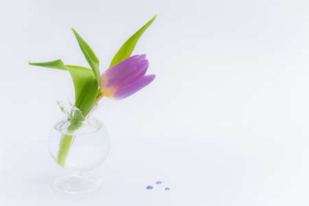 Tender violet tulip in aglass vase on pastel violet background. Greeting card for Women's day. Place for text.