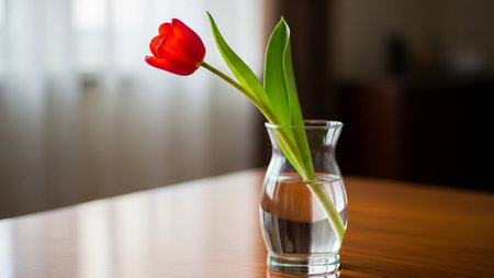 A single bright red tulip stands tall in a clear glass vase on a rustic wooden table. Sunlight filters through a nearby window, creating a warm, inviting atmosphere.