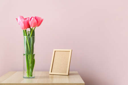 Vase with tulips and blank photo frame on table near color wall