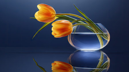 Two orange tulips in full bloom are presented within a clear glass vase against a dark blue background. The elegant composition highlights the flowers and their reflection. Soft lighting enhances the textures and colors, suggestive of decorative or artistic projects. The image is suitable for various commercial uses.