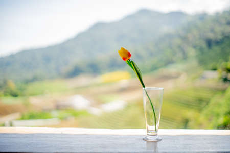 Fresh tulips bouquet in a glass standing on a table against, front view, blurry mountain background.