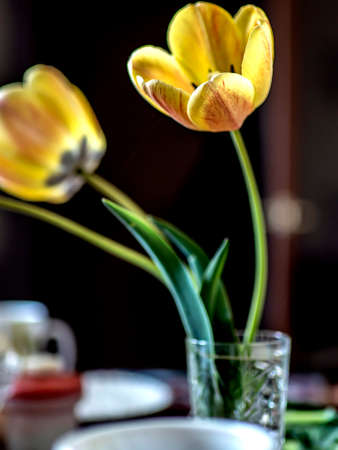 Closeup Beautyful Tulips in a glass vase for display in a coffee shop, office or restaurant