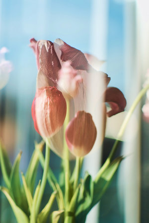 the wilted tulips on the windowsill, the beauty of wilting, the metaphor of aging, the beauty of old age, artistic double exposure