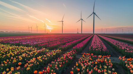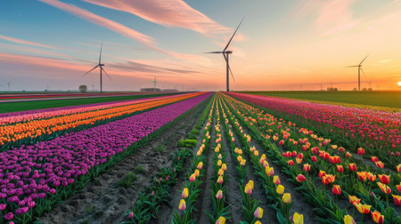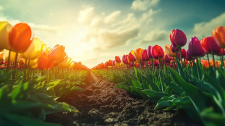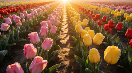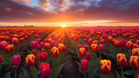 Explore a stunning spring scene showcasing vibrant tulip fields under a golden sunrise. Experience nature's beauty with lush colors and serene vibes.