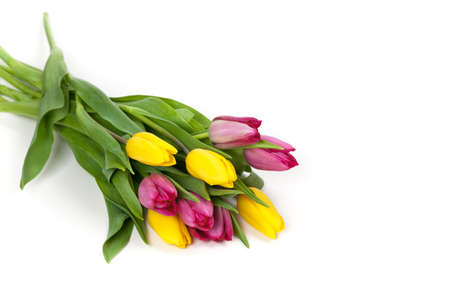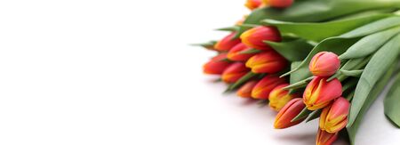Bouquet of yellow and red tulips arranged on the left on white background with copy blank space on the right. Template for greeting cards.
