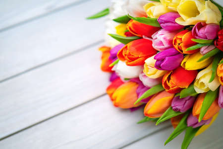 Colorful tulips flower composition over white wooden table background with copy space. Love, Mothers day, Womens day and spring time flower background. Spring nature background.